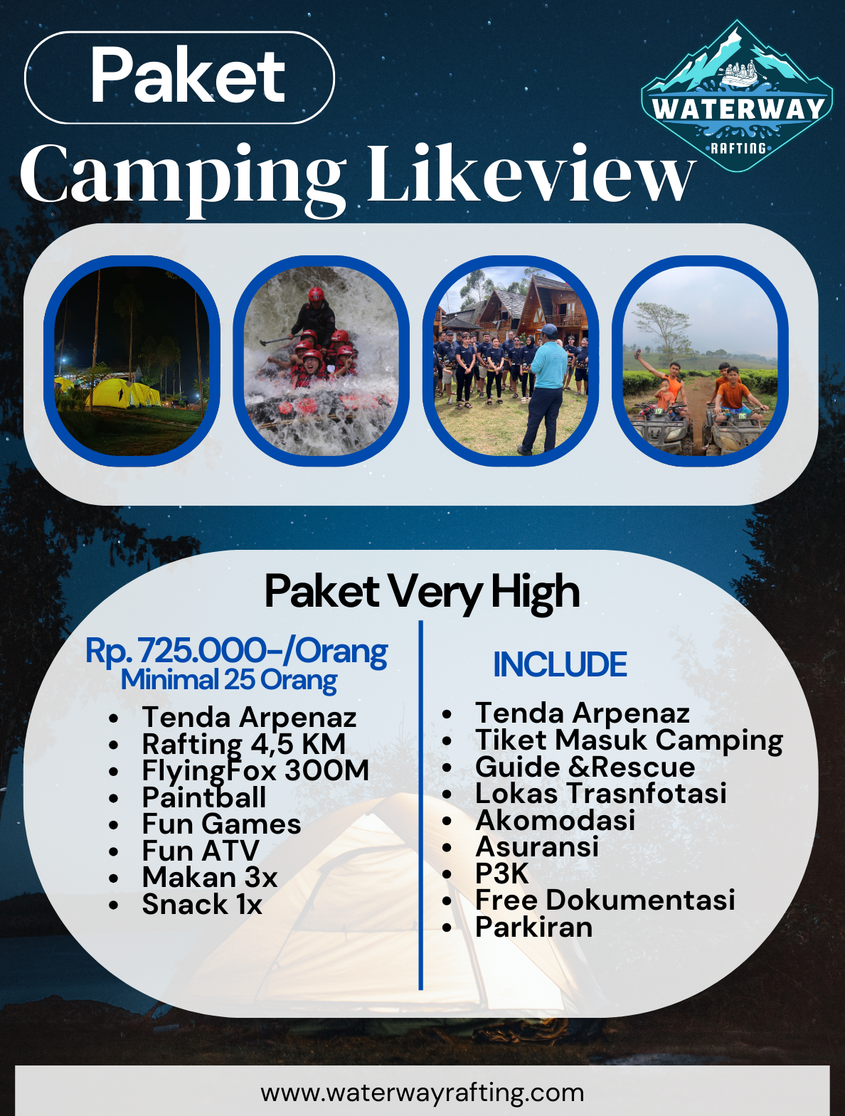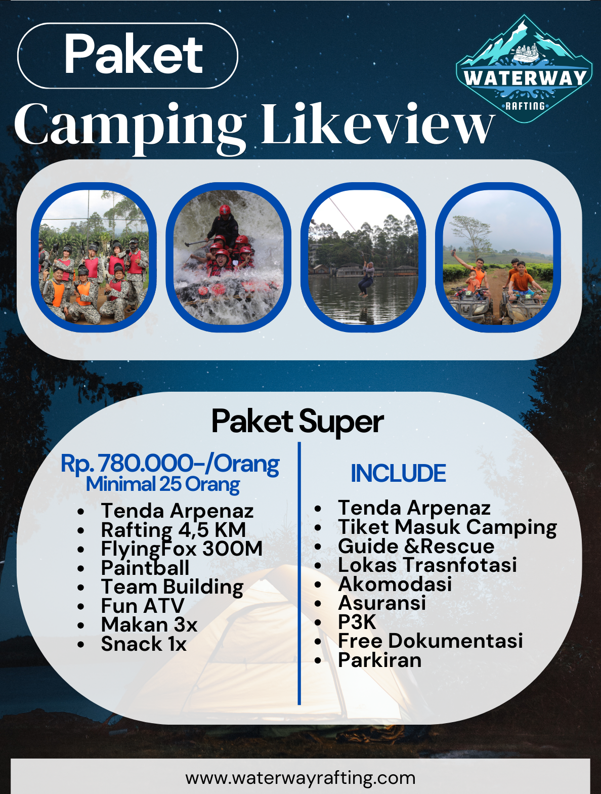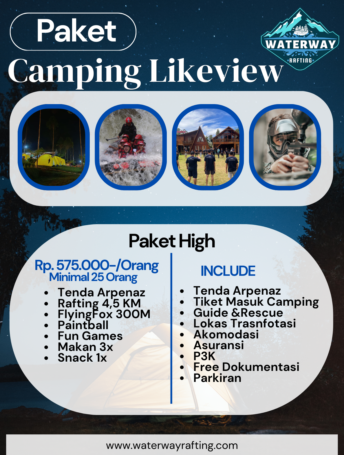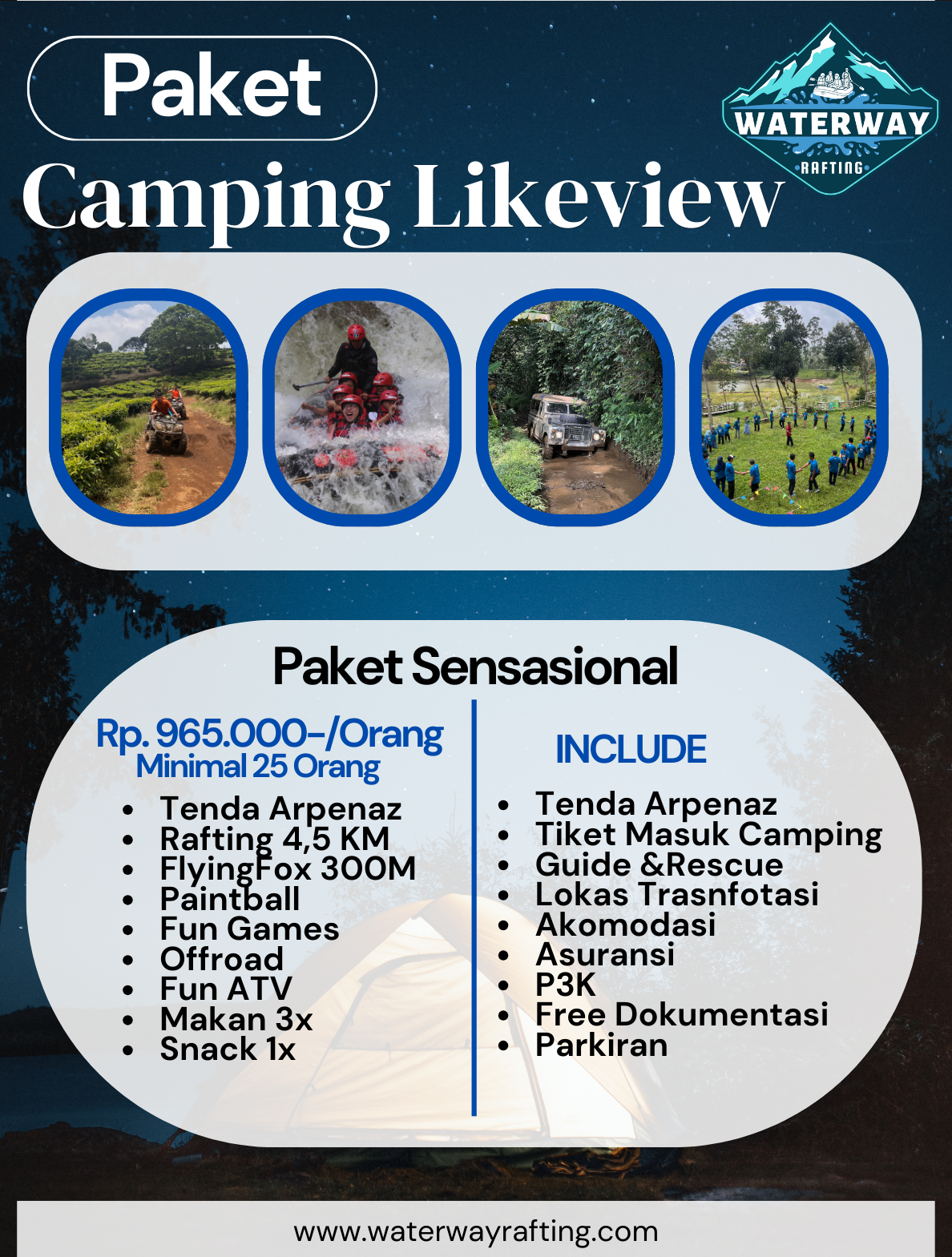Cocok untuk kegiatan healing, edukasi, gathering, hingga petualangan seru, paket ini dirancang dengan berbagai pilihan aktivitas tambahan seperti rafting, outbound, paintball, api unggun, dan tracking alam.