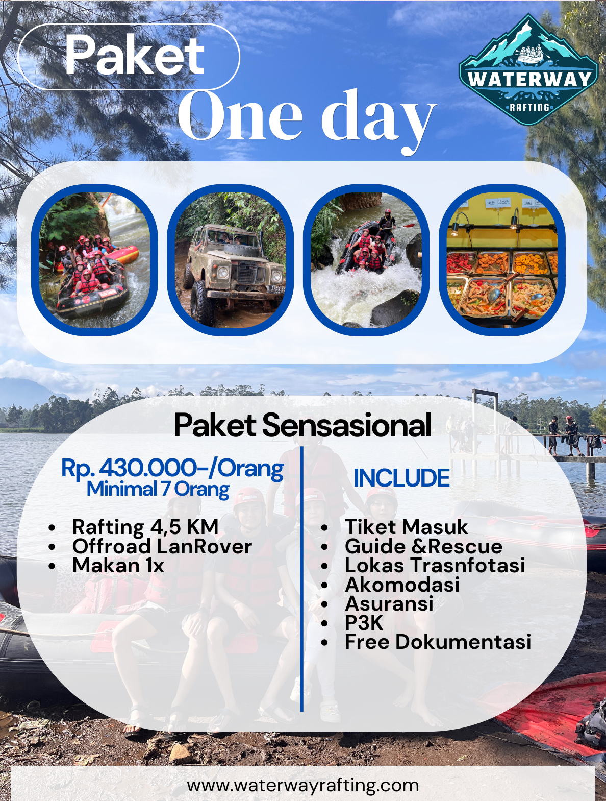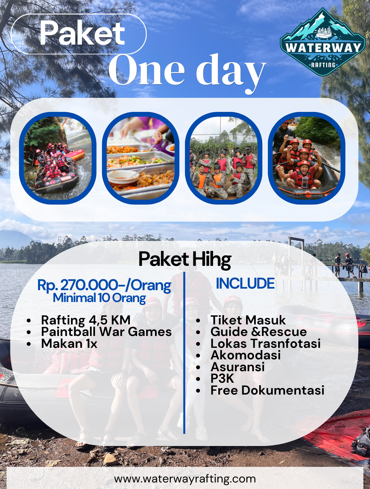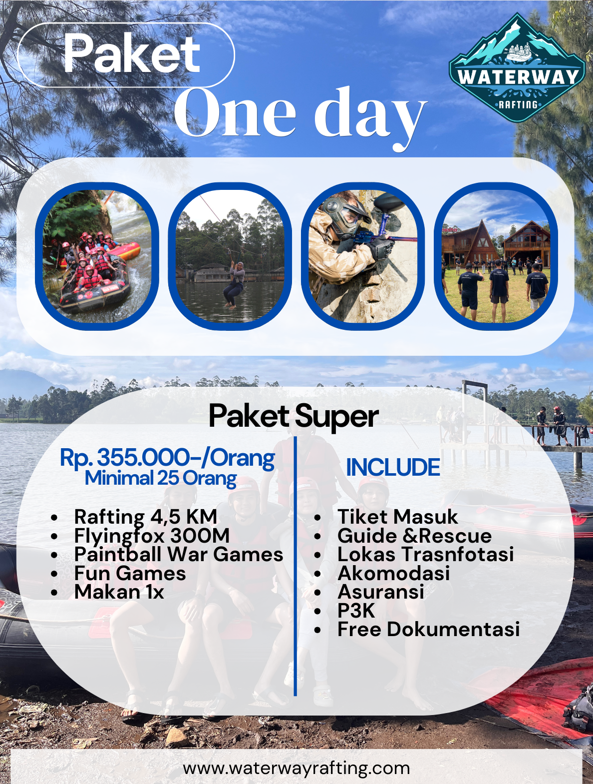 Paket One Day Adventure adalah program wisata petualangan sehari penuh yang dirancang untuk memberikan pengalaman seru, menyenangkan, dan menyegarkan di alam terbuka Pangalengan. Dengan kombinasi kegiatan seperti rafting, offroad, paintball, flying fox, ATV, dan team building, paket ini cocok untuk semua kalangan: mulai dari keluarga, komunitas, instansi, hingga perusahaan.